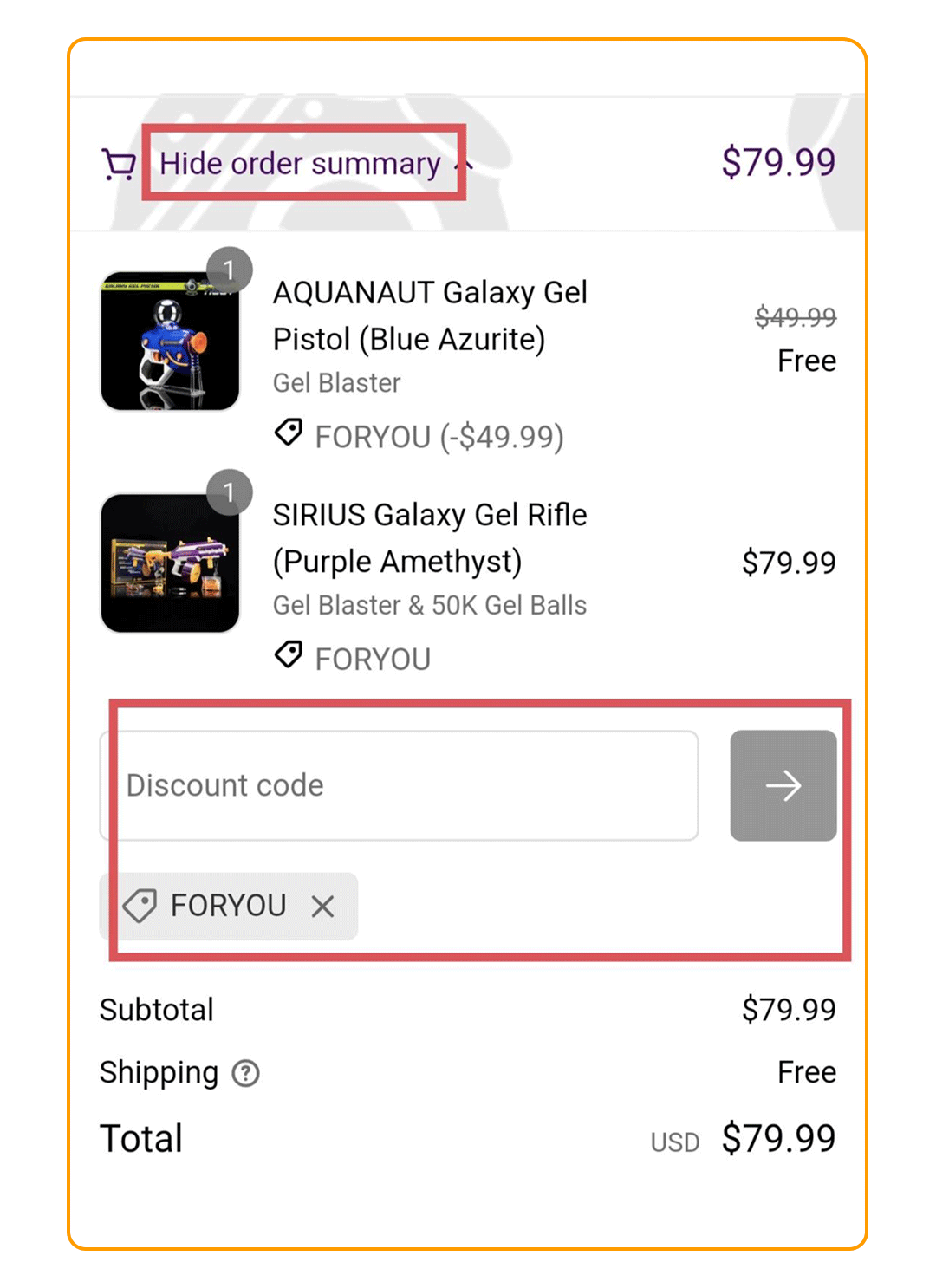 Click the "Check Out" bottom and then click the "Show order summary" to enter the discount code and continue to payment.