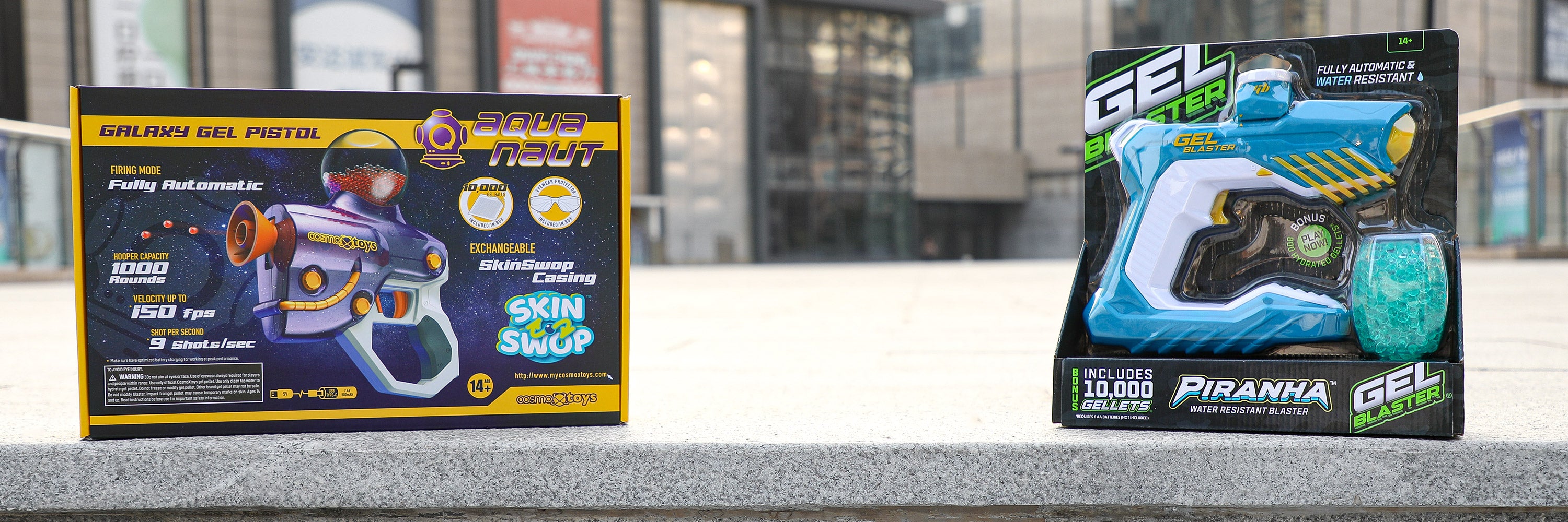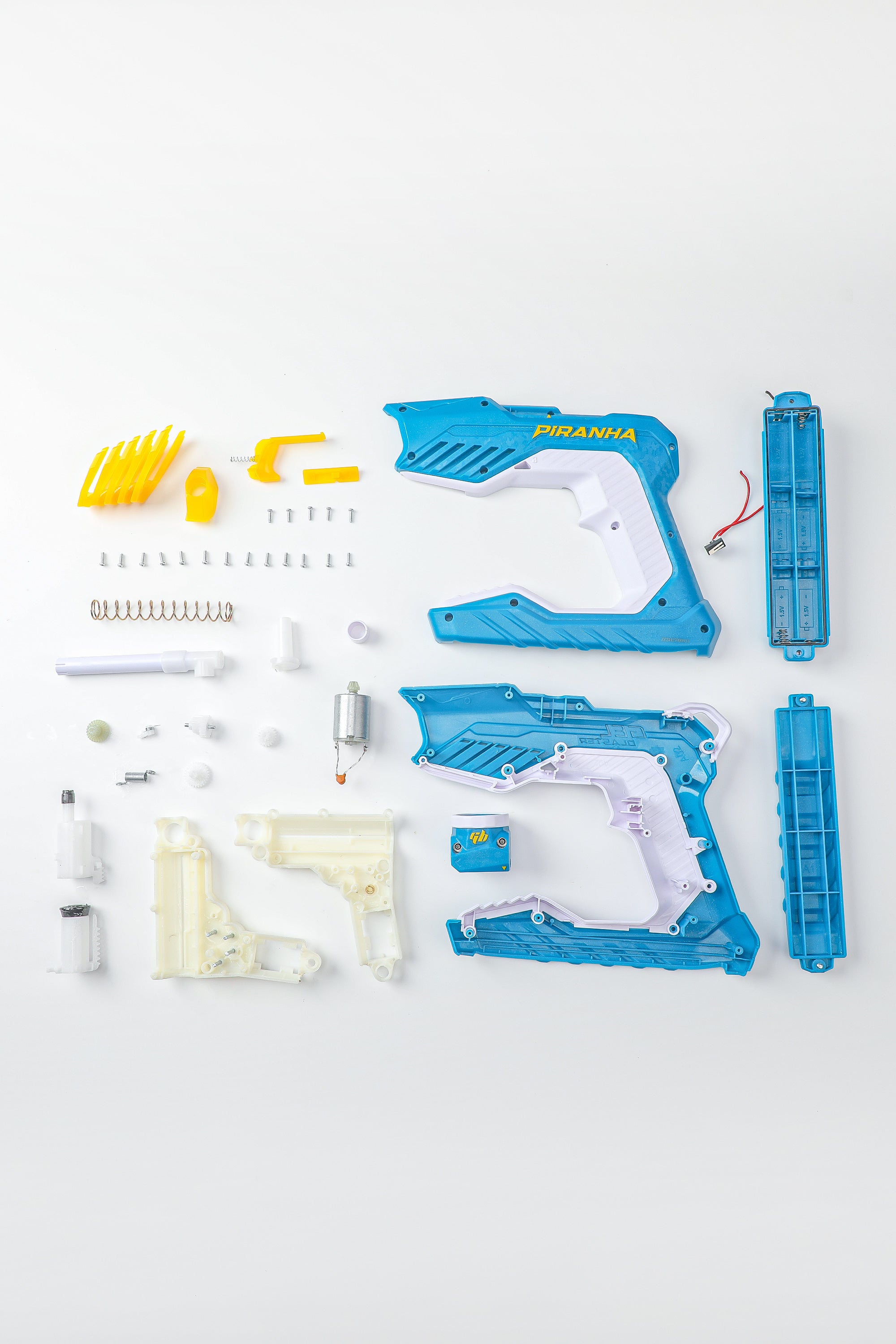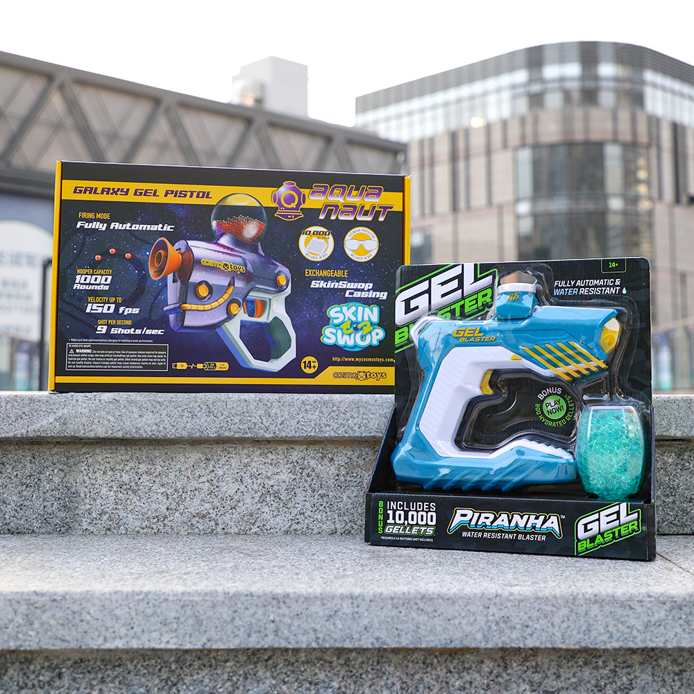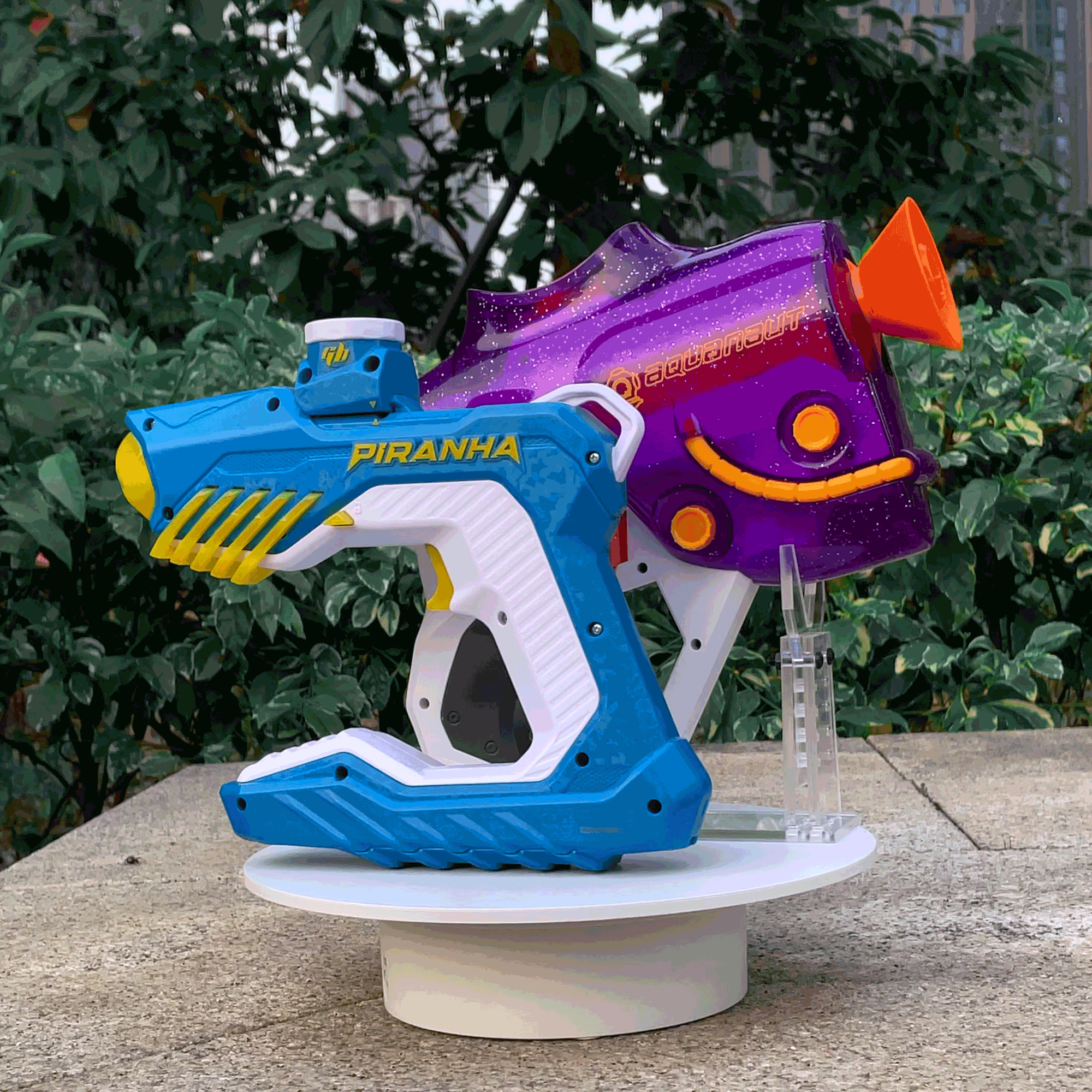 Comparatively, with its shell installed, the Aquanaut has a larger and slightly thicker volume than the Piranha. Consumers can select from a range of colors for the Aquanaut's shell, which is also adorned with sequins that enhance its visibility and transparency in sunlight. On the other hand, the Piranha's shell showcases yellow modules and blue scales. Both products utilize an upper hopper feed system for ammunition supply and are equipped with safety switches. The Piranha's hopper can hold 800 gel balls, while the Aquanaut can accommodate up to 1000 gel balls.