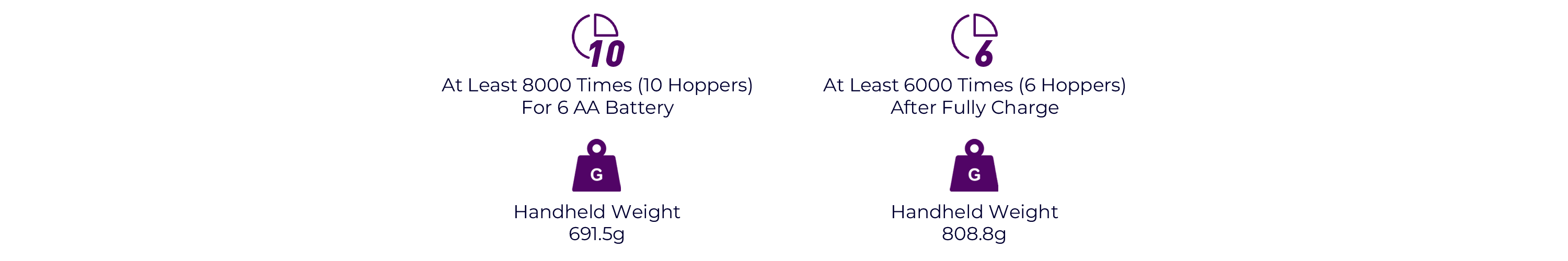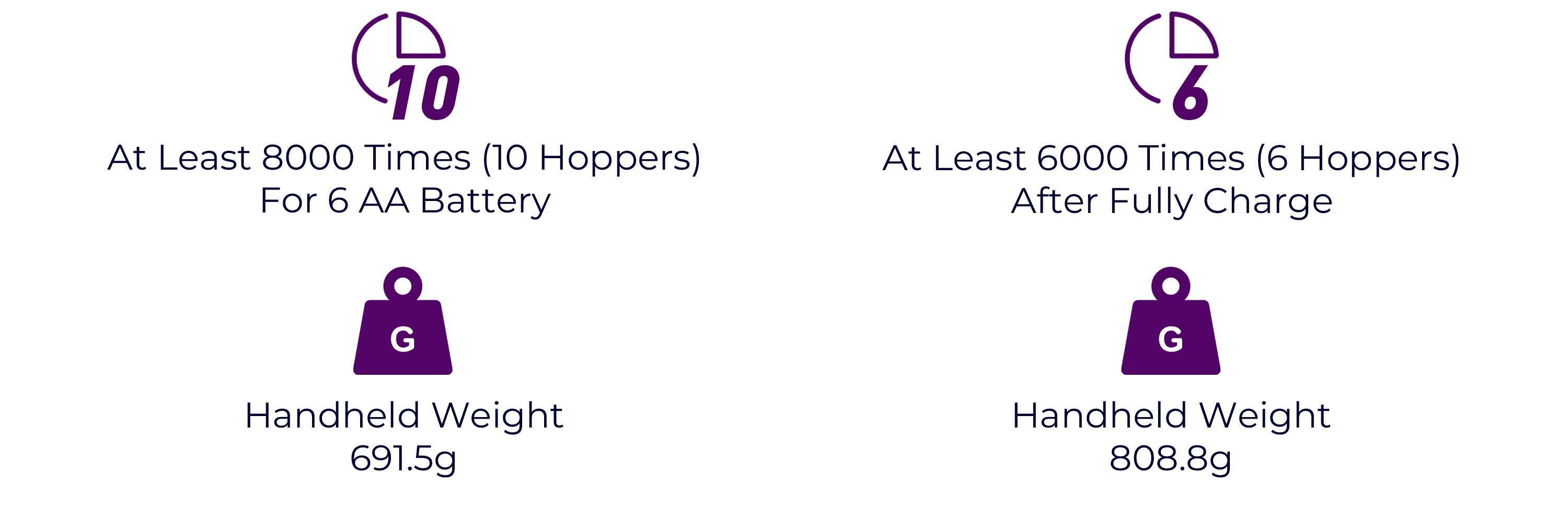 - The primary distinction between the two products lies in their power source. Piranha relies on 6 AA batteries for power, while Aquanaut is equipped with a 500 mAh lithium-ion rechargeable battery charged by USB-C. According to testing, Piranha can fire approximately 8000 rounds (10 hoppers) using 6 AA batteries, which costs about USD$4. On the other hand, Aquanaut's charging cost is almost negligible and when fully charged, it can excite about 6000 rounds (6 hoppers).