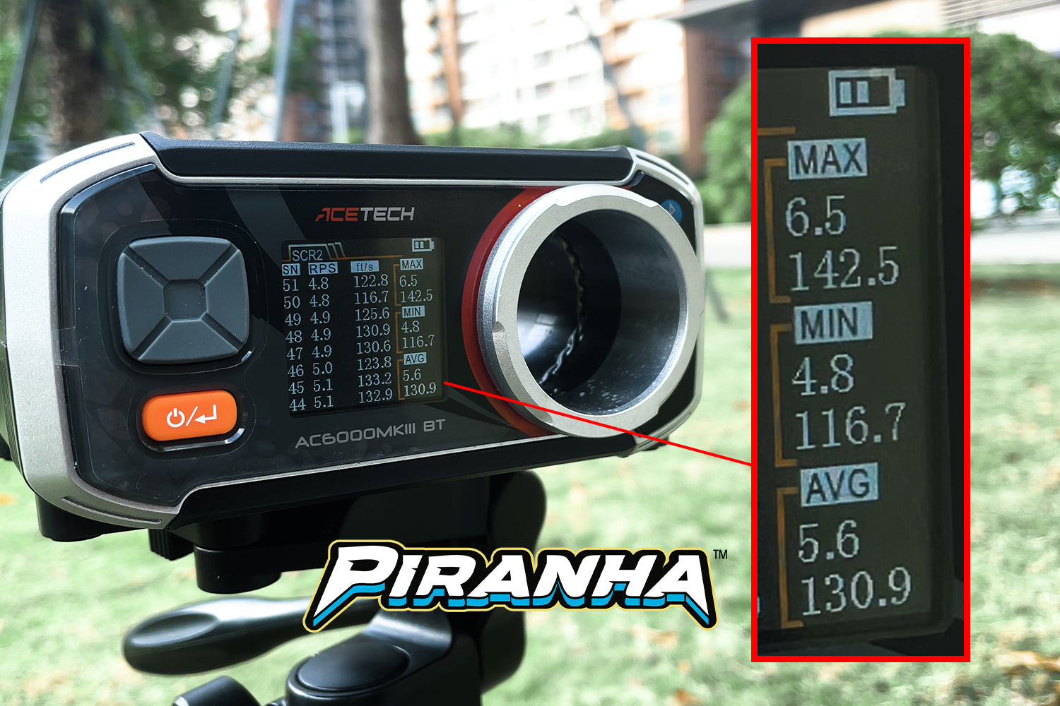 Under the same environmental condition and using the same gel balls, Piranha's average speed is 130.9 fps, with maximum and minimum speeds of 142.5 fps and 116.7 fps.